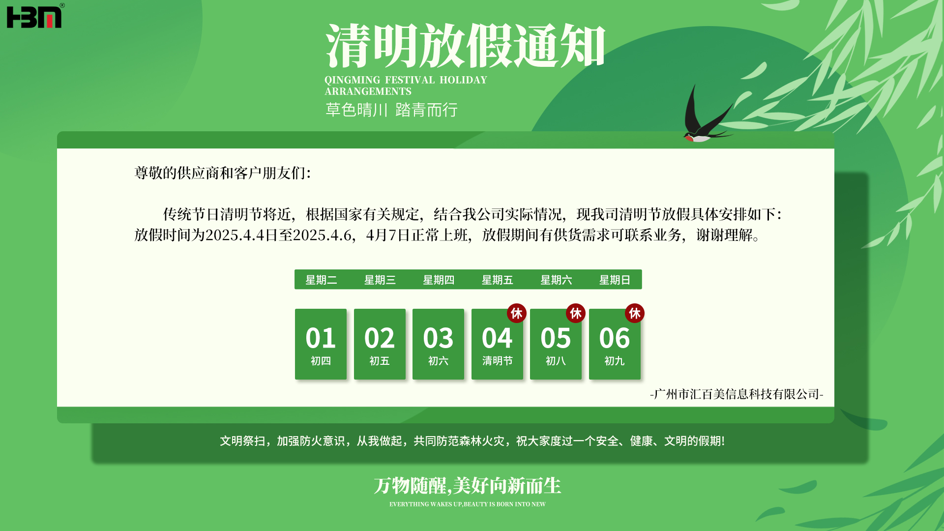 尊敬的供應商和客戶朋友們:傳統節日清明節將近,根據國家有關規定,結合我公司實際情況,現將我司清明節放假具體安排通知如下:放假時間為: 2025.4.4日至2025.4.6,4月7日正常上班,放假期間有供貨需求可聯系業務,謝謝理解.